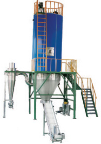 潔凈空氣加熱后進入干燥塔,在塔內熱風中用二流體(或三流體)噴嘴將各種料液物化成微小液滴,與熱風進行快速熱交換,蒸發掉液料中的水份(或溶劑),并隨熱風排出,獲得粉狀產品。